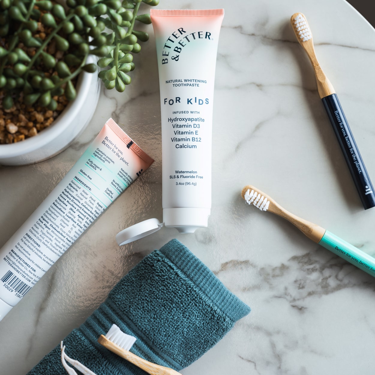 And a set of three natural bamboo toothbrushes with extra soft bristles recommended by dentists for growing mouths. Designed to fit in little hands and help kids establish earth-friendly habits with replaceable brush heads.